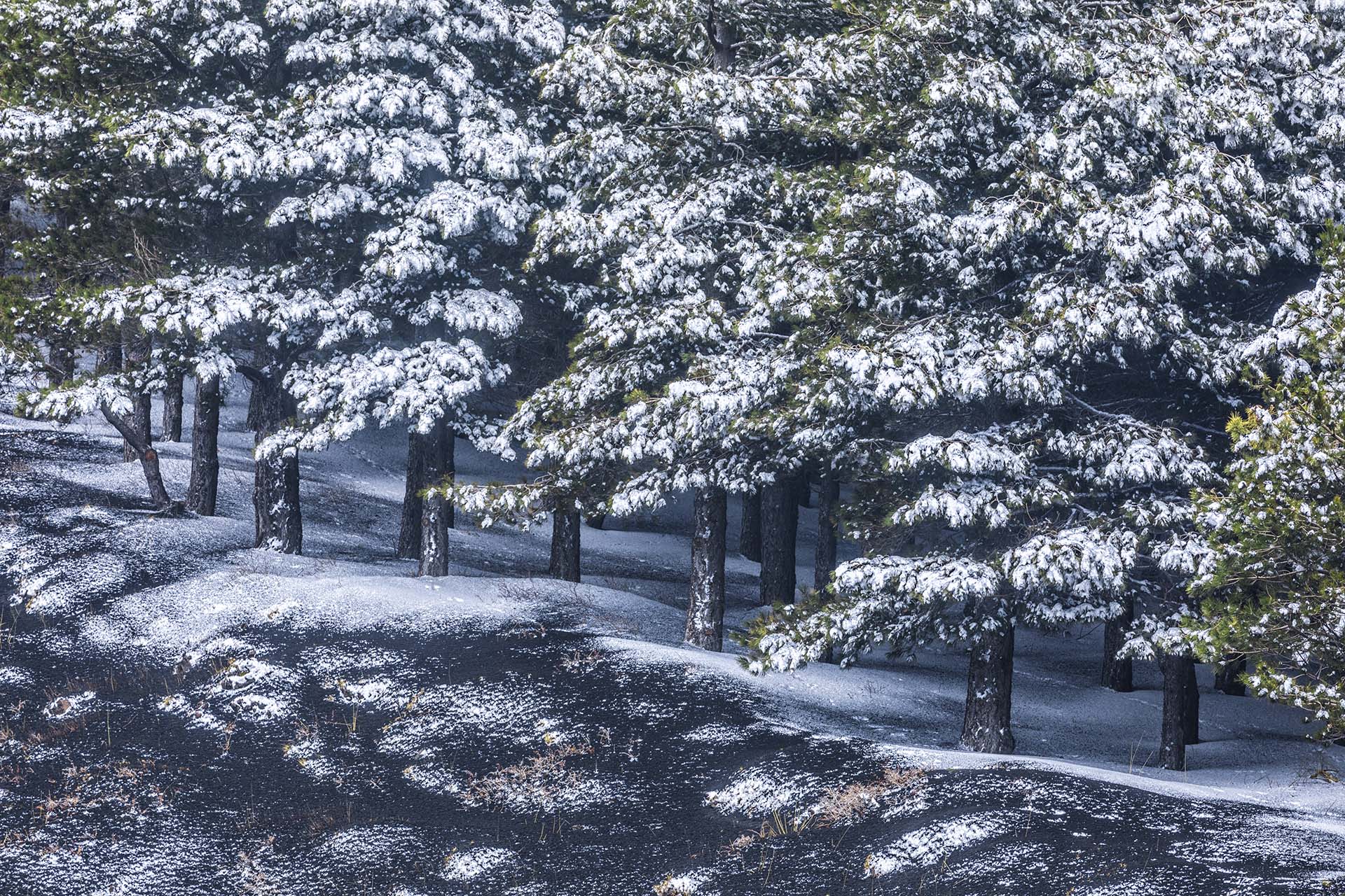 Photo by © Alessandro Saffo 2021 – All rights reserved. La cenere dell’eruzione di marzo 2021 si mischia con la neve nel bosco del sentiero schiena dell’Asino.