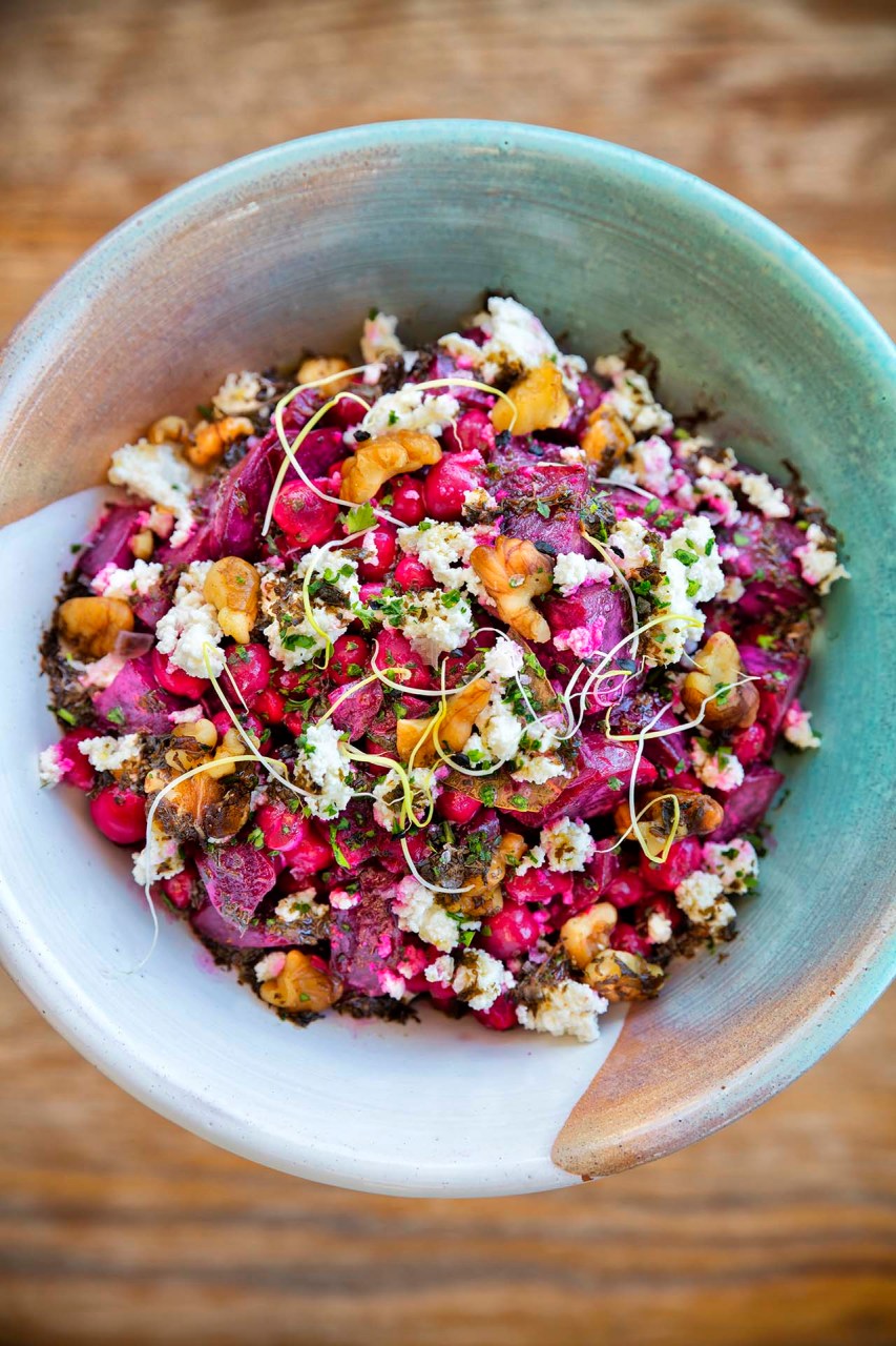 Insalata di ceci e biete con chicchi di melograno, noci, menta e anthotyro.