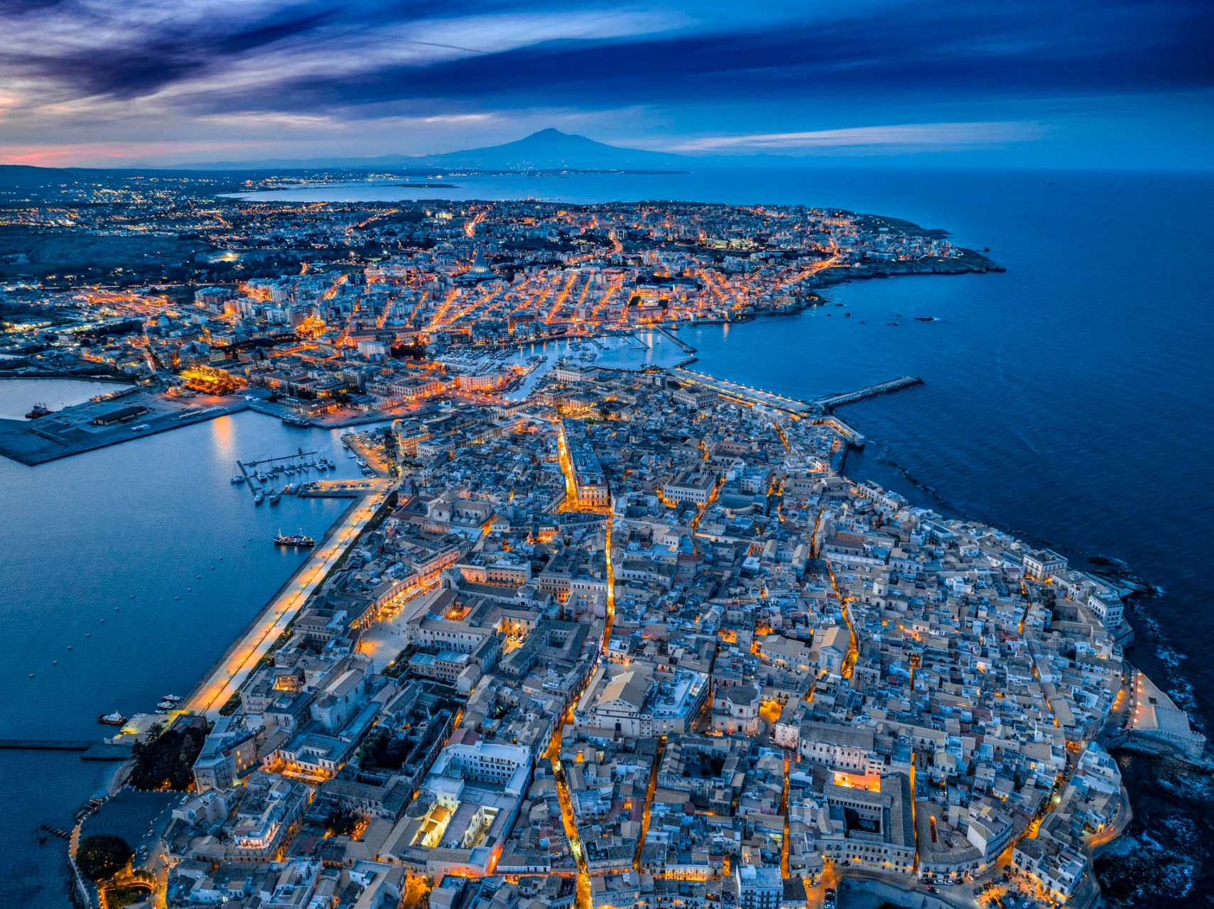 Dall’alto, Ortigia si staglia come una perla irregolare sul mare turchese dello Ionio, unita alla Sicilia da esili ponti che sembrano fili d’argento. Le sue forme ricordano una foglia o una goccia d’acqua, con la punta rivolta verso il Mediterraneo.