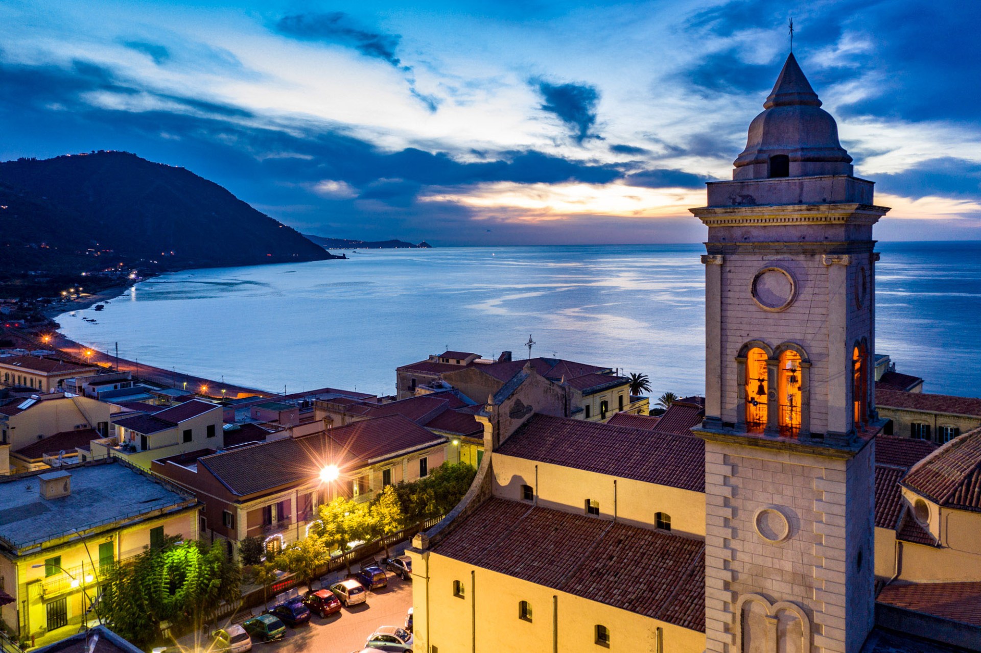 Immaginate la scena: il sole sta lentamente scivolando dietro l’orizzonte del Mar Tirreno, tingendo il cielo di una tavolozza infuocata di arancio, rosa e viola. Proprio in primo piano, silente e maestoso, si erge il campanile della Chiesa di San Nicola di Bari. Infatti, la sua silhouette elegante si staglia contro questo sfondo naturale di rara bellezza.
