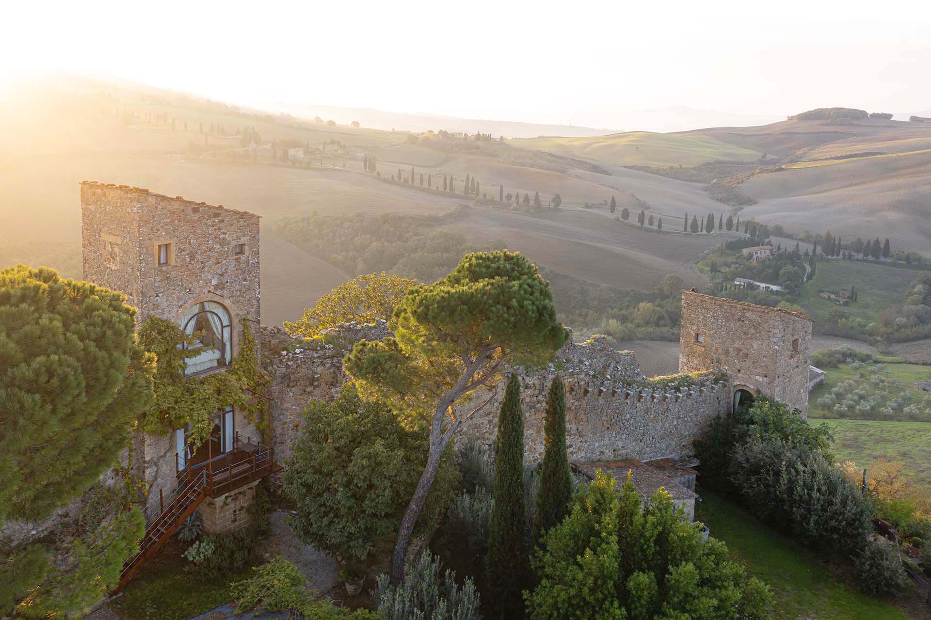 Prime luci sulle mura del borgo di Monticchiello e sulle colline della Val d’Orcia patrimonio dell’umanità.