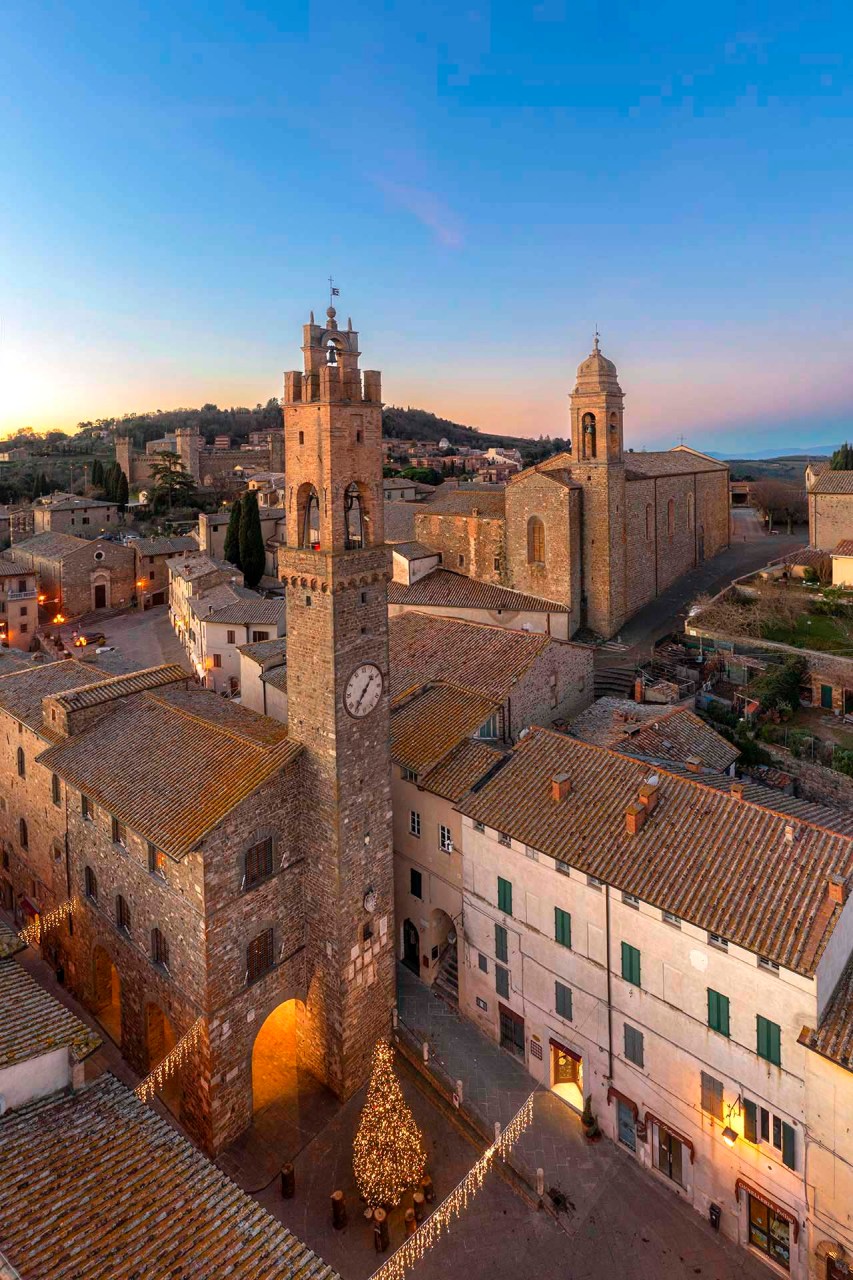 Il Palazzo dei Priori in Piazza del Popolo a Montalcino durante le feste natalizie.