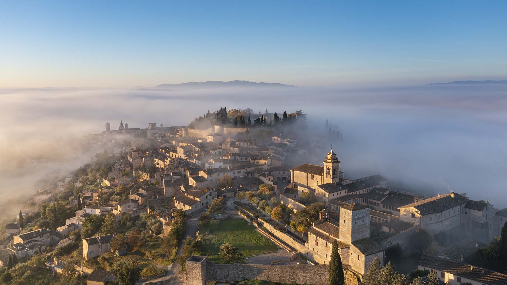 La nebbia mattutina accarezza il borgo Spello in Umbria.