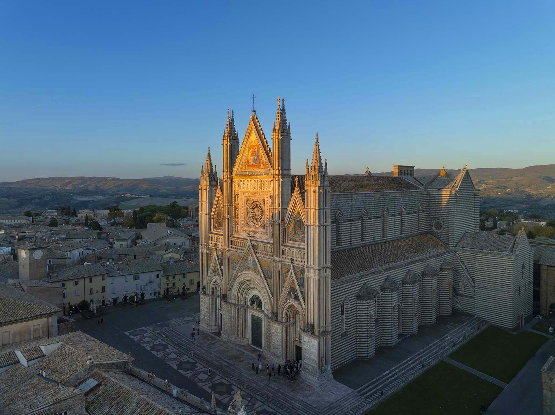 Esistono momenti in cui l’architettura smette di essere pietra e diventa pura emozione. Uno di questi è quando la facciata del Duomo di Orvieto viene baciata dall’ultima luce calda del tramonto. In quegli istanti, la “Cattedrale d’Oro” dell’Umbria si accende, trasformando il mosaico e il marmo in un prisma radioso che sembra brillare di luce…