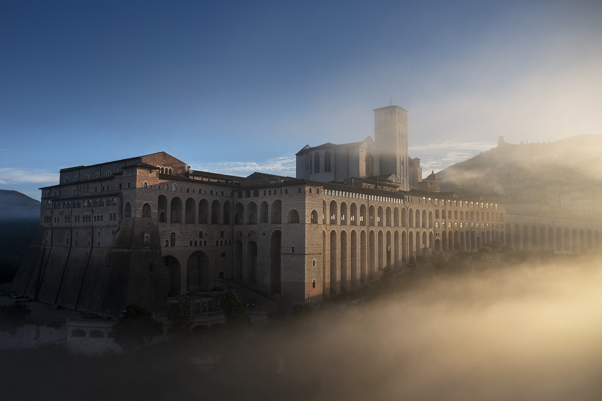 Assisi e la Basilica di San Francesco accarezzate dalla nebbia mattutina.