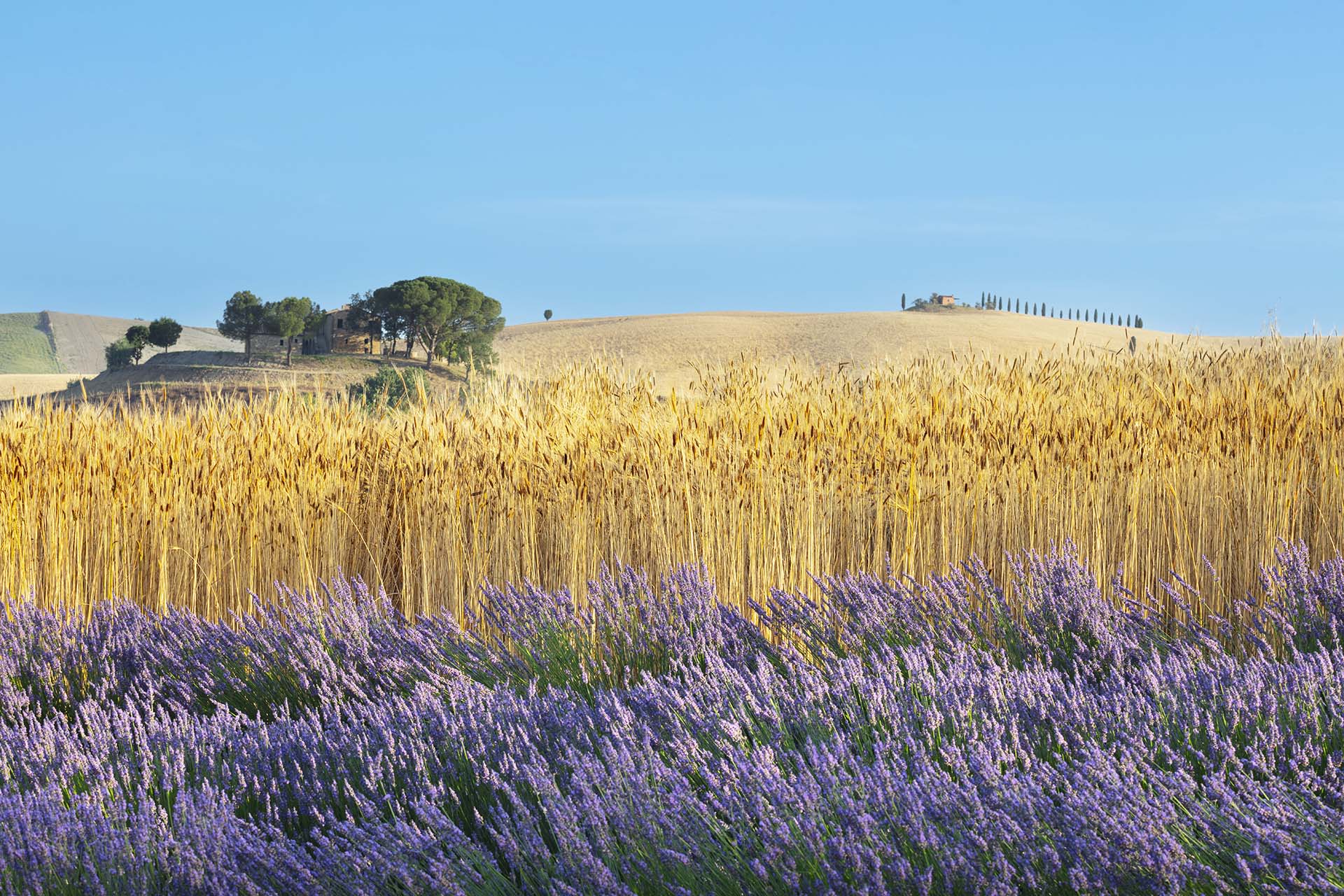 Campi di grano e lavanda della Val d’Orcia in Toscana.