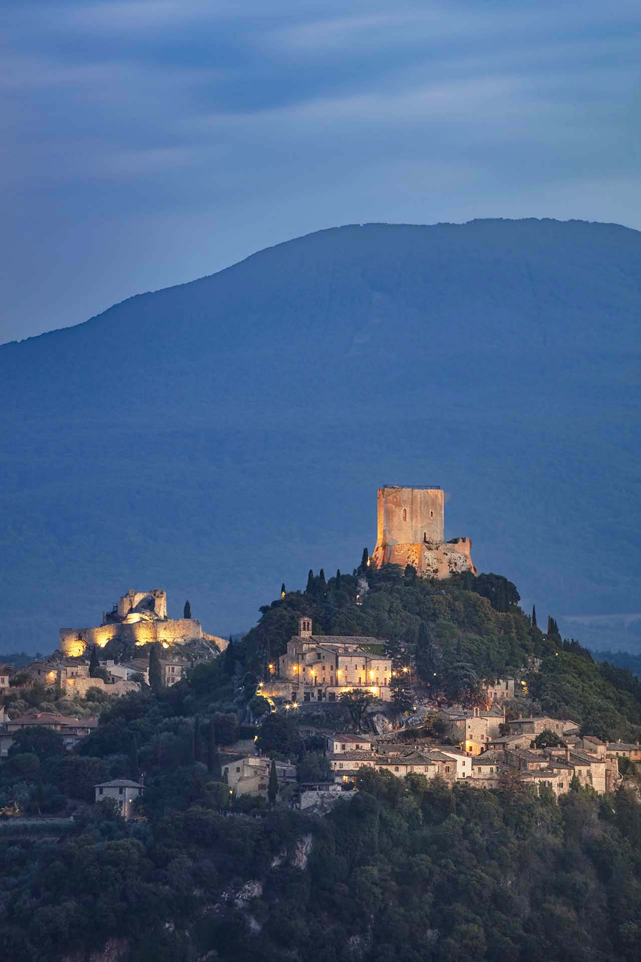 La Rocca di Tentennano che domina il piccolo borgo di Rocca d’Orcia. Sullo sfondo Castiglione d’Orcia e il Monte Amiata.